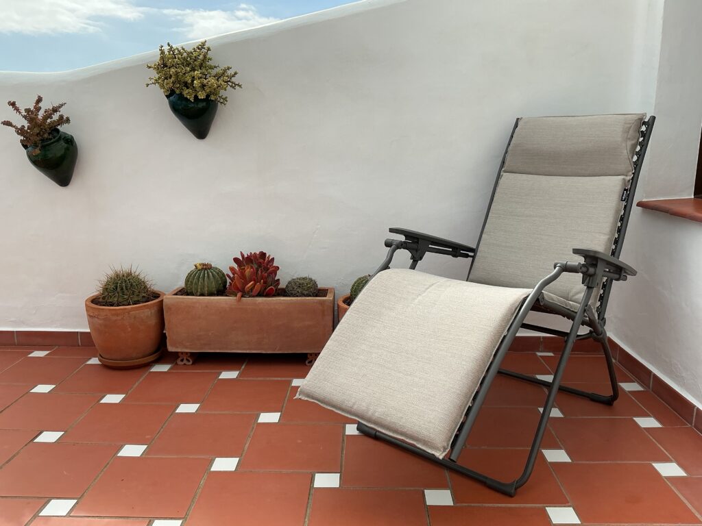 Terrasse, Gartenmöbel, Markise, 2 x Sonnenliegen.