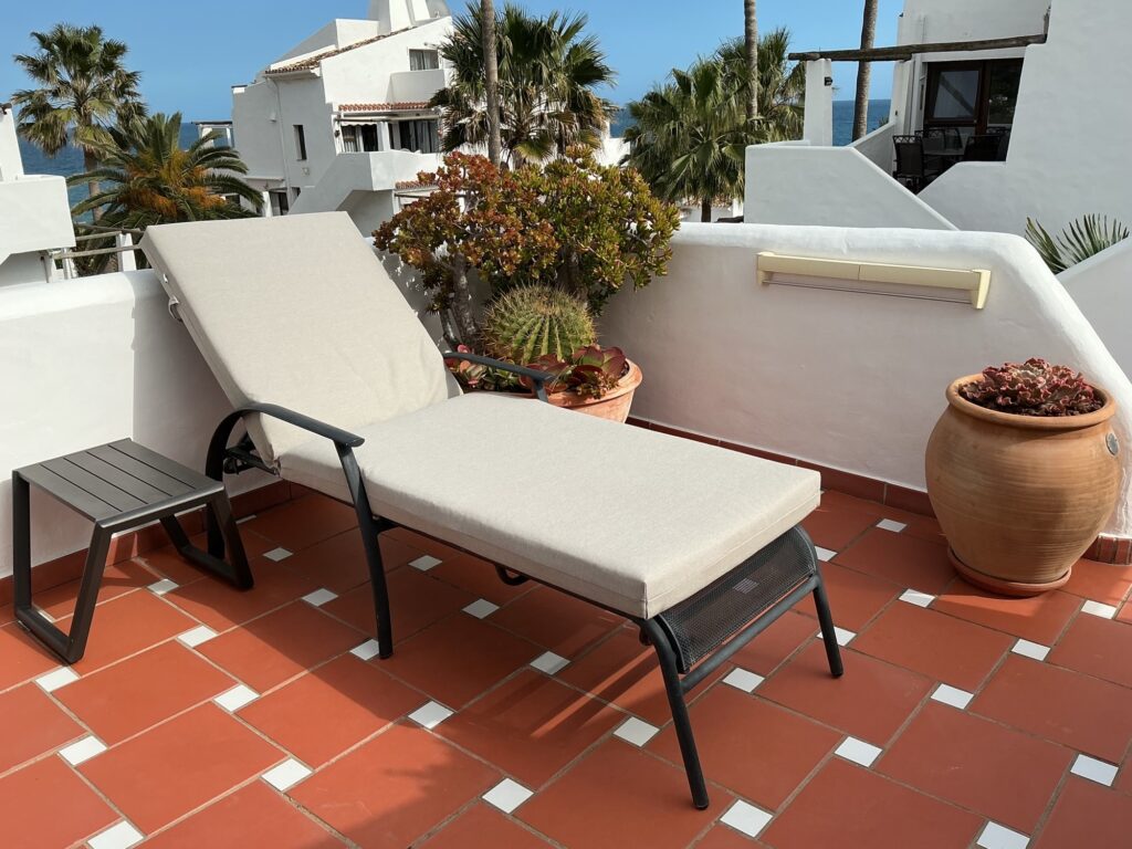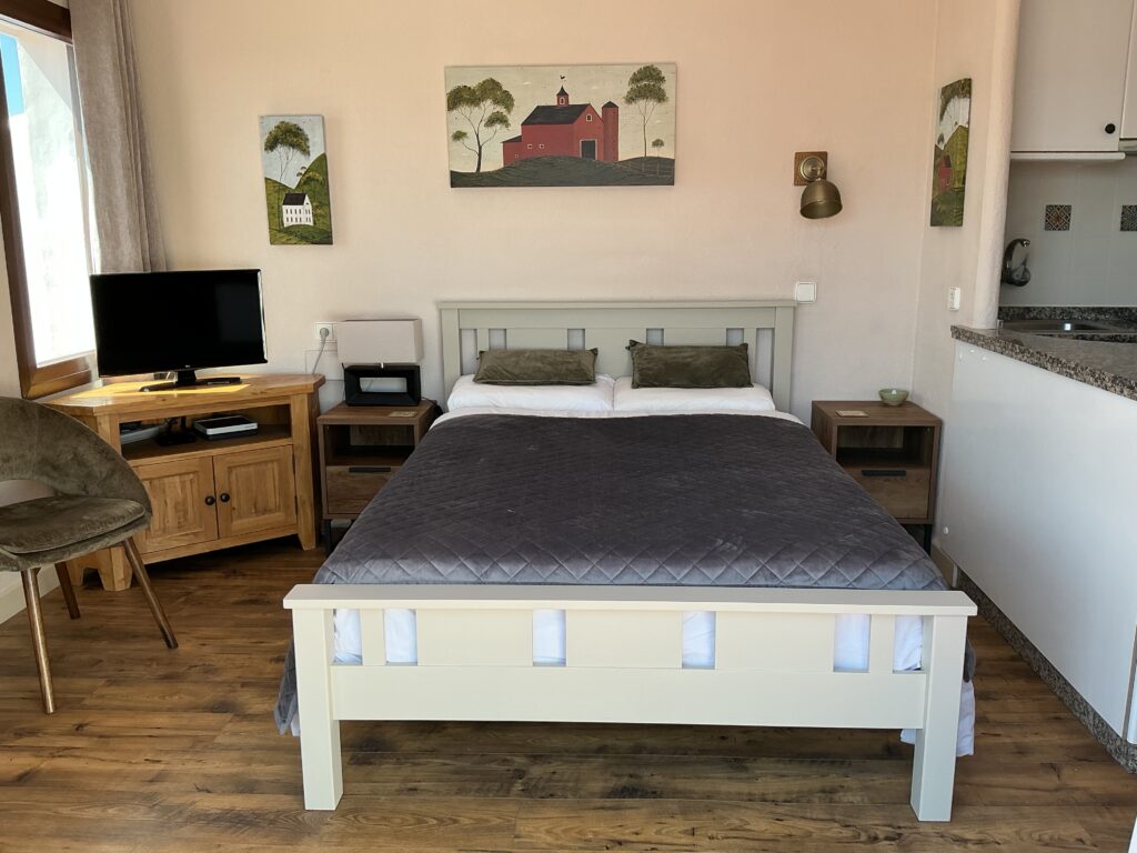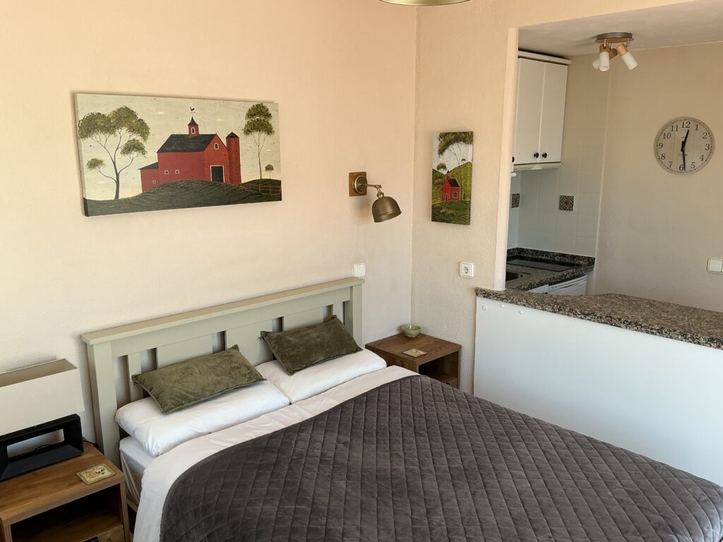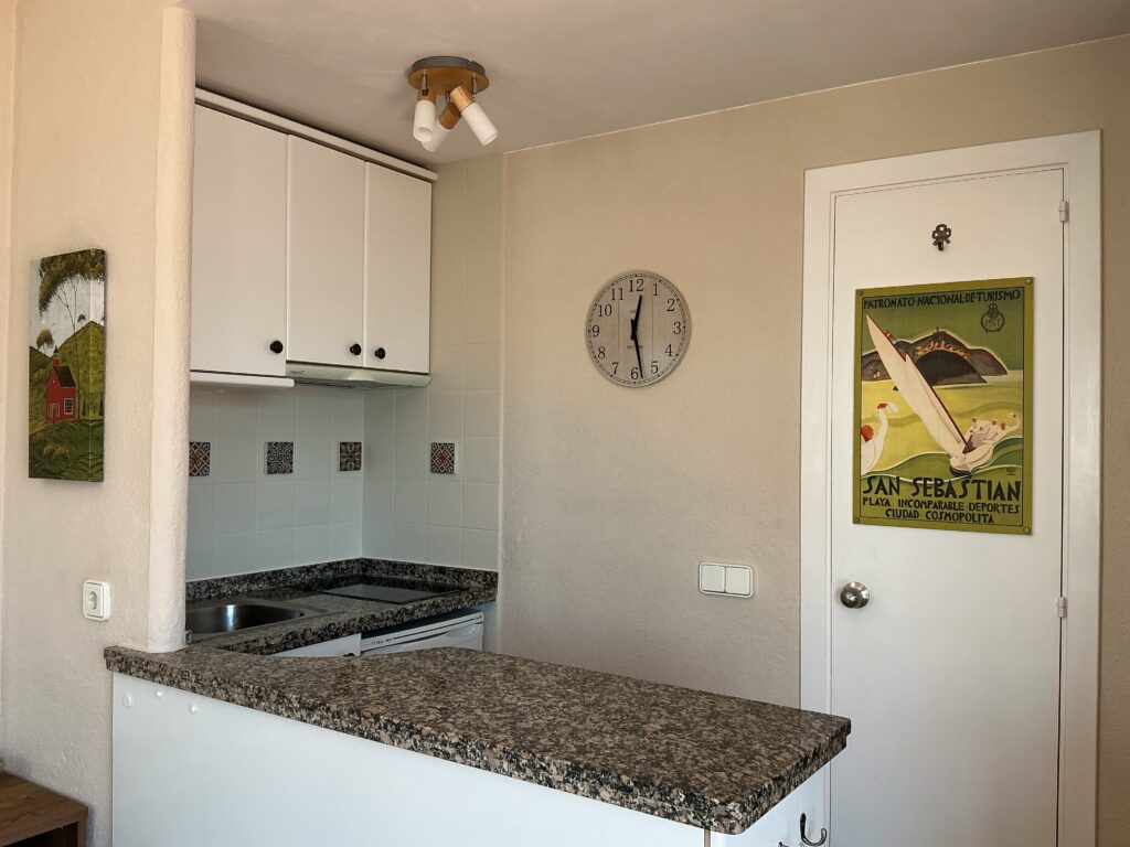 452 liegt im Zentrum von Costa Natura und ist eine Wohnung im obersten Stockwerk, die vom Hauptpoolbereich entfernt ist. Auf der ruhigen L-förmigen Doppelterrasse mit Garten kannst du zwischen Sonne und Schatten wählen. Wunderschöner Blick auf die Berge, den Garten und teilweise auf das Meer. Es hat neue Terrassentüren, eine neue Klimaanlage und einen Smart-TV mit einem umfangreichen mehrsprachigen Satelliten-TV-Paket (inklusive Radio und Musik). Unbegrenztes, schnelles Glasfaser-WLAN. Außerdem gibt es ein Doppelbett mit Tempur-Schaumstoffmatratze und ein Badezimmer mit einer neuen, massiven Marmor-Dusche mit großem Regenschauer-Duschkopf. Die Terrasse hat eine ausfahrbare Markise, Tisch und Stühle, eine Sonnenliege und einen Sonnenschirm. In der Wohnung gibt es zwei Sessel und die Vorhänge sind mit Verdunkelungsstoffen versehen. Die Küchenzeile hat eine neue Eichenholzkommode, eine Kombi-Mikrowelle und einen Herd mit zwei Kochstellen. Kühlschrank mit Gefrierfach, Kaffeemaschine, Bügelbrett und Bügeleisen, Haartrockner, Toaster, Wasserkocher und Telefon. Der Stil ist modern mit einem warmen und einladenden Ambiente.