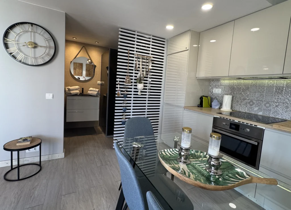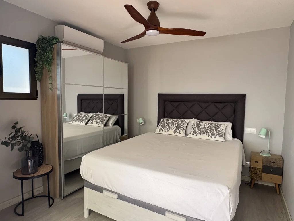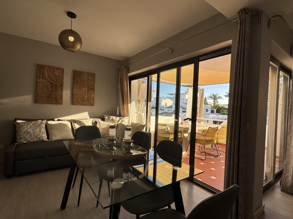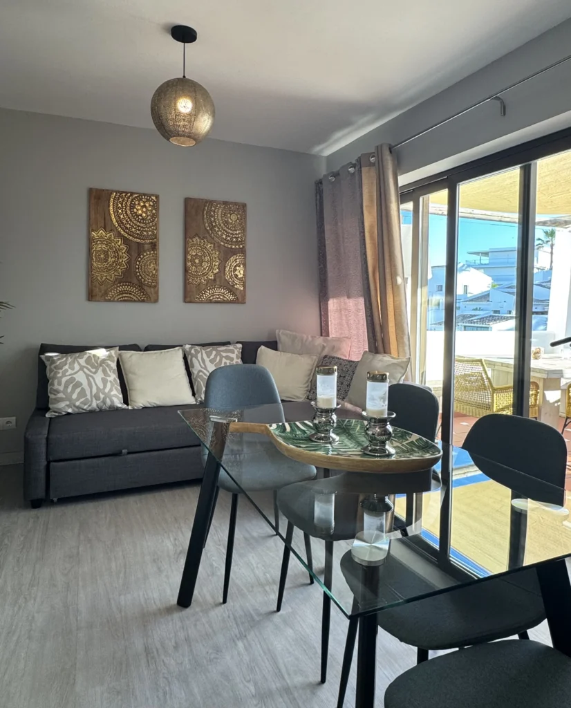 Fácilmente accesible desde la entrada principal, sin escaleras para entrar. Este apartamento dispone de una terraza cubierta y otra descubierta. Exterior reciente de estilo ibicenco/balinés, interior abierto, con cocina totalmente equipada (Incluye horno/microondas combi, lavavajillas, congelador grande y electrodomésticos de inducción), baño de diseño, Smart TV, WiFi, ventilador de techo silencioso y ¡mucho más!
