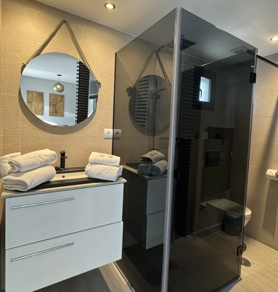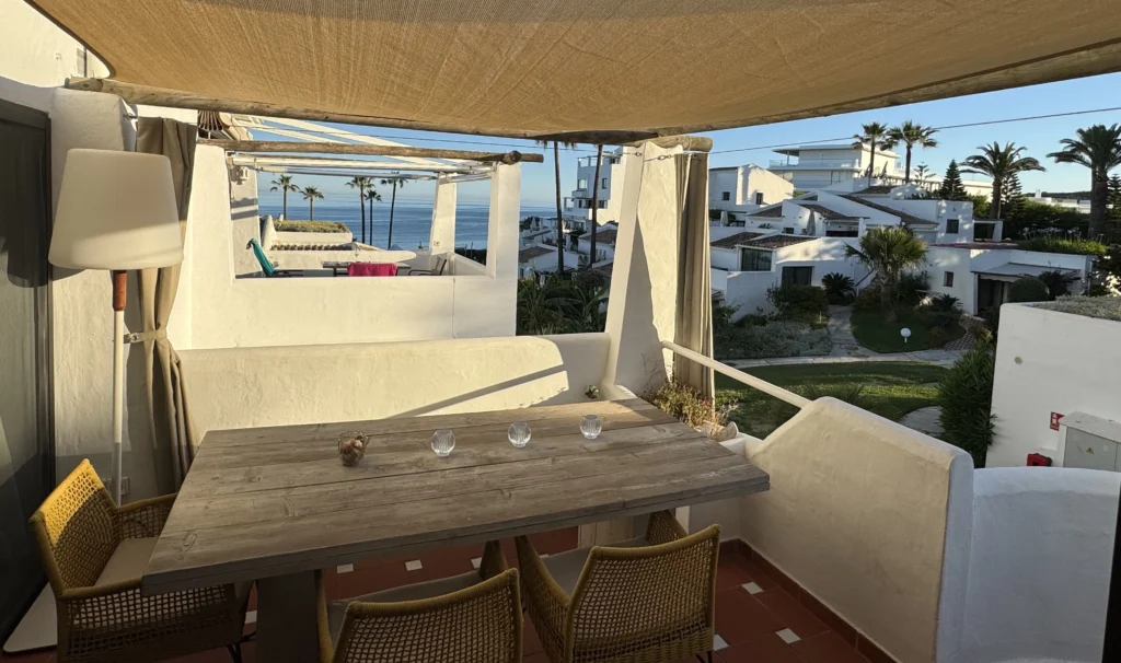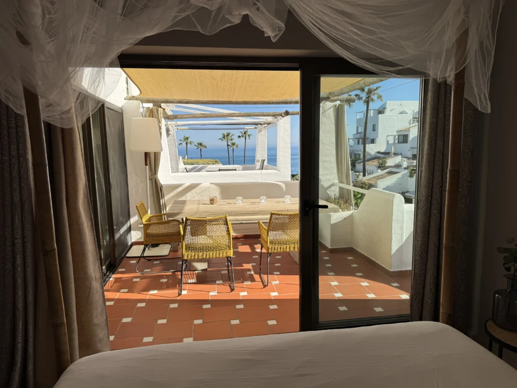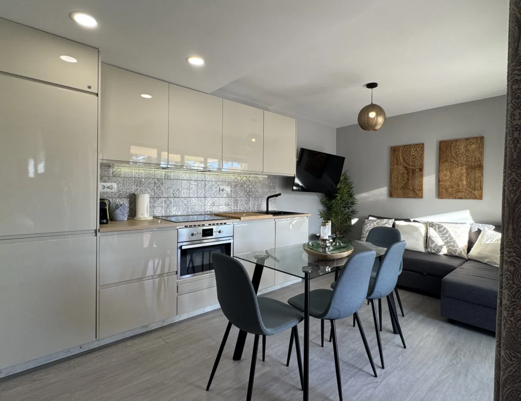 Fácilmente accesible desde la entrada principal, sin escaleras para entrar. Este apartamento dispone de una terraza cubierta y otra descubierta. Exterior reciente de estilo ibicenco/balinés, interior abierto, con cocina totalmente equipada (Incluye horno/microondas combi, lavavajillas, congelador grande y electrodomésticos de inducción), baño de diseño, Smart TV, WiFi, ventilador de techo silencioso y ¡mucho más!