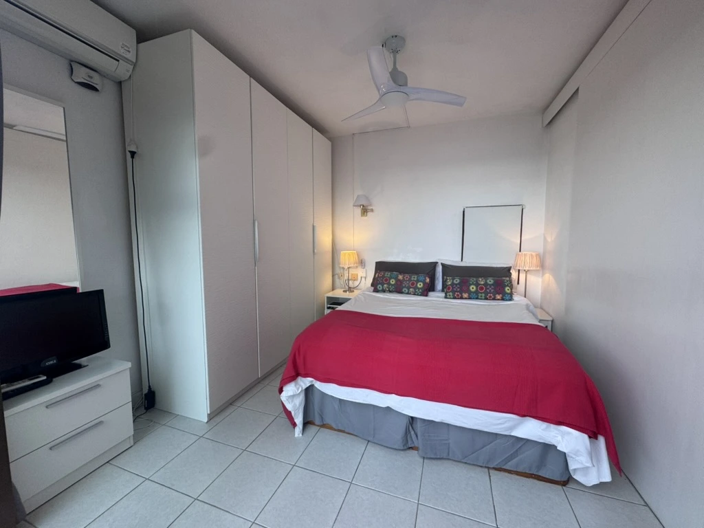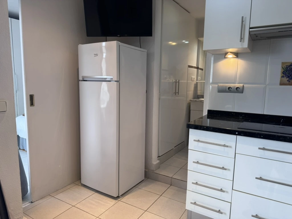 La cocina americana, bien equipada, es nueva, con superficies de trabajo de mármol negro, cocina de tres fogones con extractor. Hay microondas, cafetera, hervidor de agua, tostadora y un gran frigorífico-congelador independiente. El cuarto de baño tiene un lavabo con espejo iluminado, ducha esquinera y más espacio de almacenamiento. Hay un aseo separado. La zona del dormitorio está separada de la sala de estar y tiene una comodísima cama de matrimonio tamaño king. Desde aquí hay otras puertas que dan a la terraza y cortinas casi opacas.