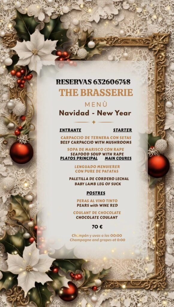 Este año, el restaurante The Brasserie ha preparado un menú exclusivo para Navidad y Nochevieja, pensado para quienes buscan una cena de calidad en un entorno cálido y acogedor. Además, la noche del 31 estará acompañada por música en directo, creando el escenario perfecto para despedir el 2025 y dar la bienvenida al 2026 por todo lo alto.