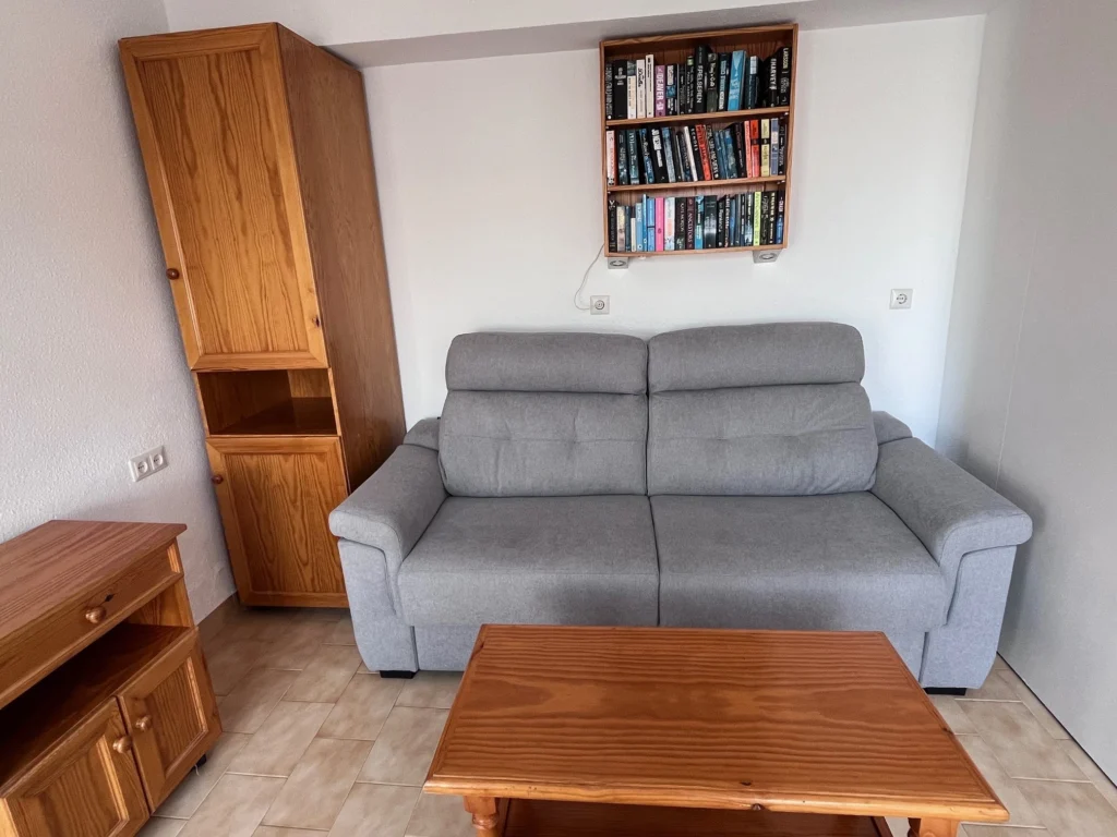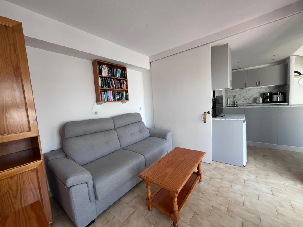 Le coin salon à gauche dispose d'un canapé-lit double et d'une table basse. Celle-ci est séparée de la kitchenette par une porte coulissante.