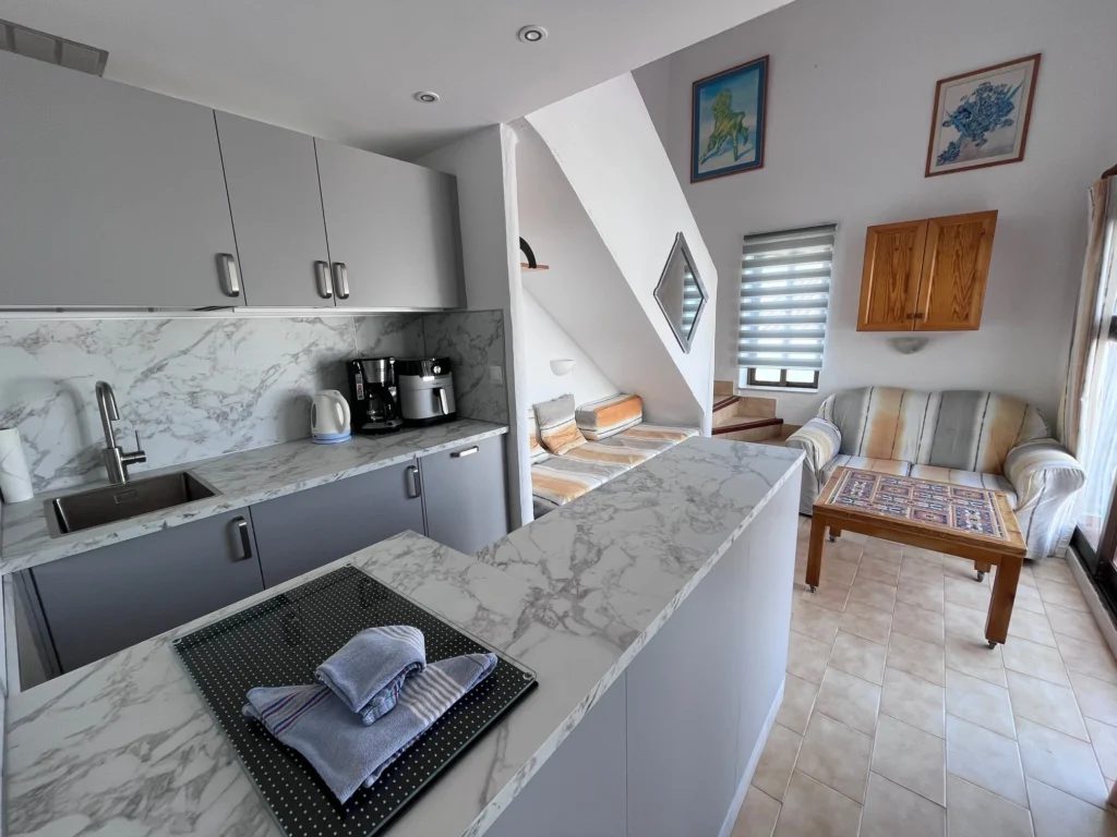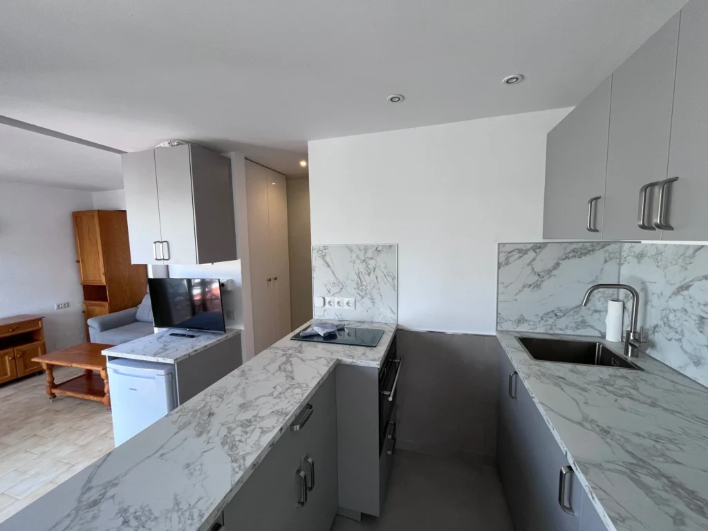La kitchenette est équipée d'une plaque vitrocéramique à trois feux. L'espace de droite dispose également d'un canapé 2 places, d'un canapé encastré et d'une télévision. Salle de bain entièrement rénovée avec douche de plain-pied et toilettes séparées.