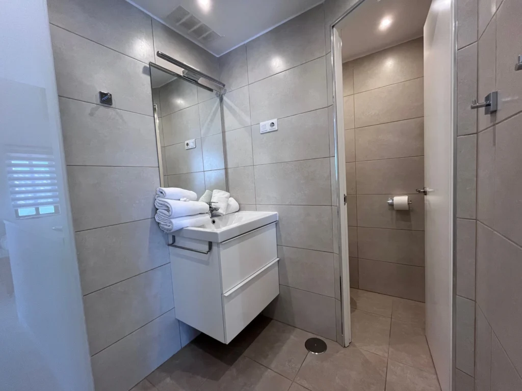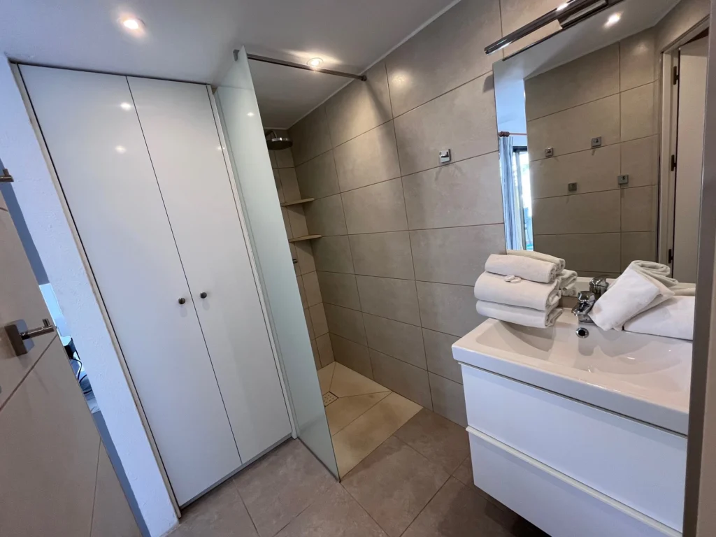 Toilettes, serviettes, douche.